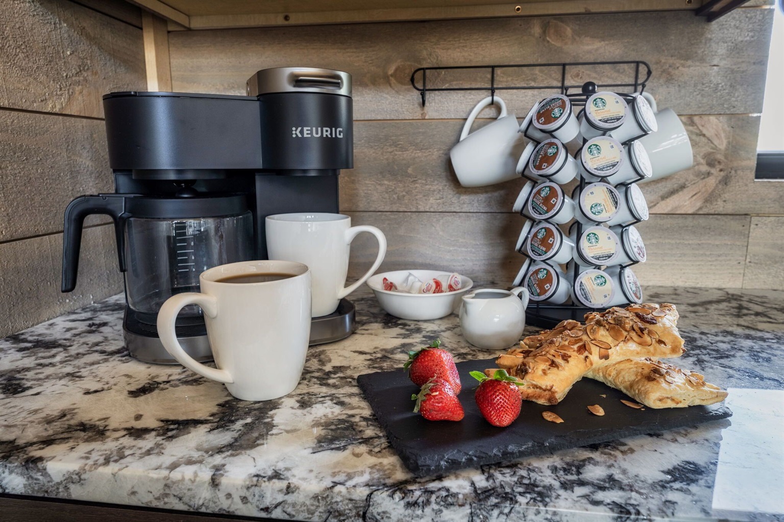 3. What does the kitchen include? –The kitchen is stocked with everything you would expect in a normal kitchen plus a toaster, waffle maker, crock-pot, blender, various size pots & pans, a teapot, a regular coffee pot and a Keurig Machine. BRING YOUR OWN COFFEE!